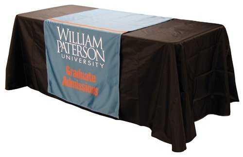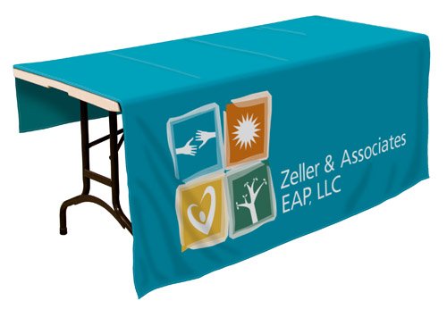 Custom Trade Show Table Throws and Table Runners are digitally printed in full color. Table Throws are available in standard 6' and 8' table lengths. Table Runners are 30" wide x 80" tall and can be used with any length table.