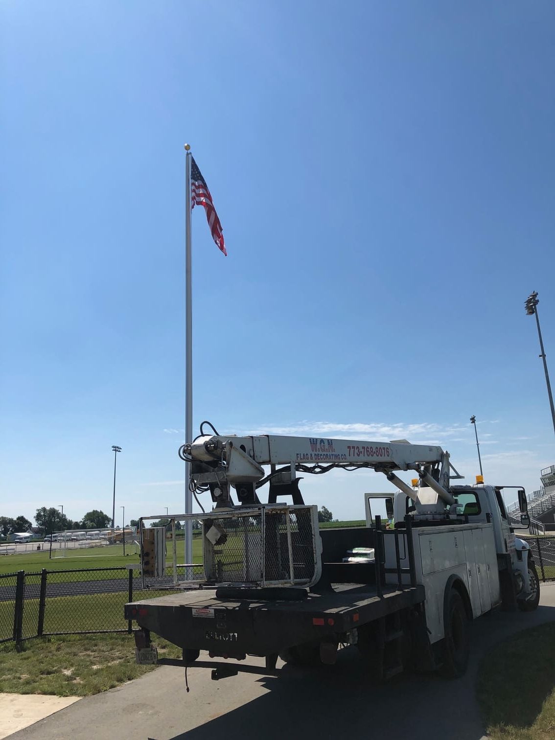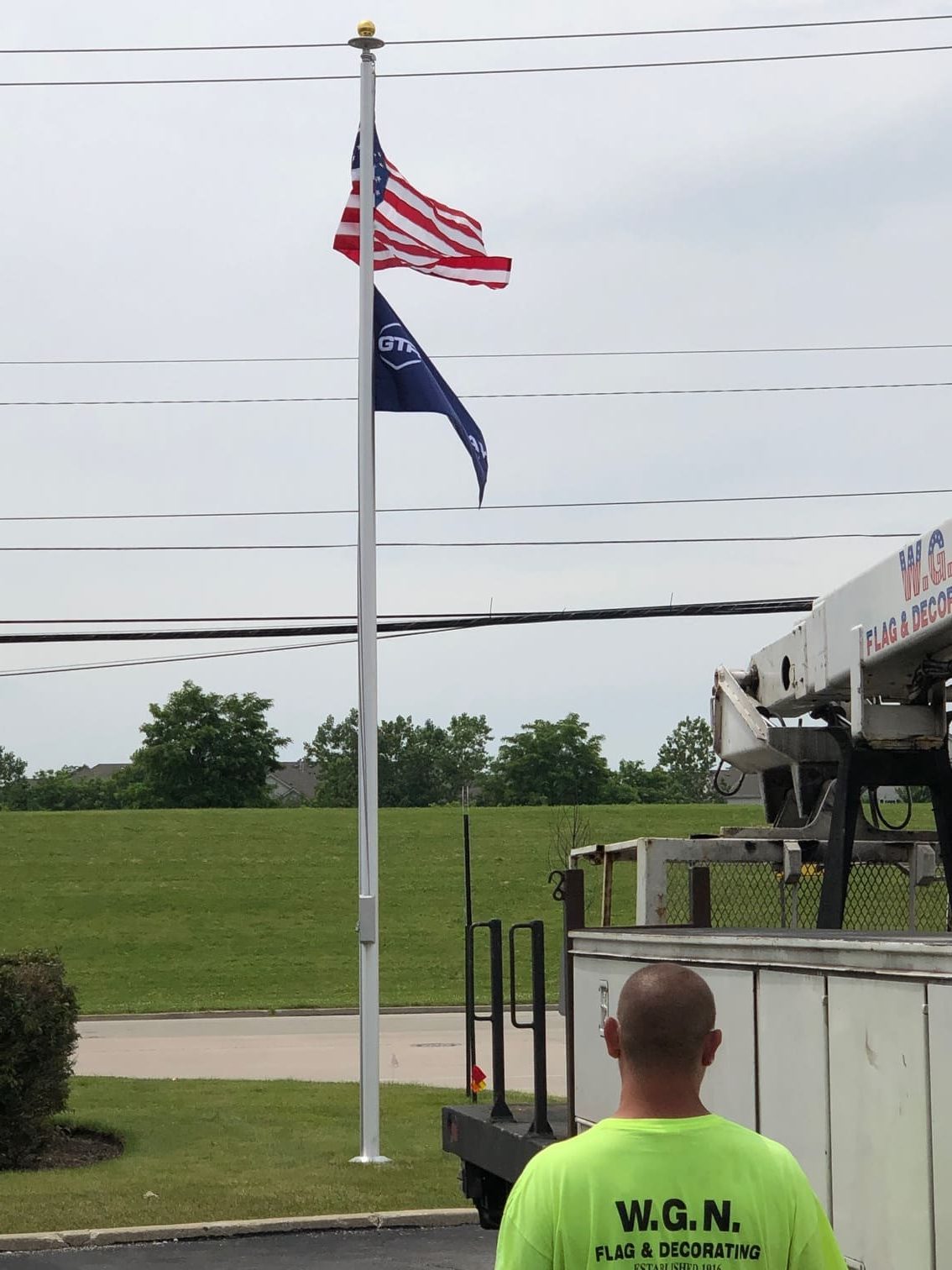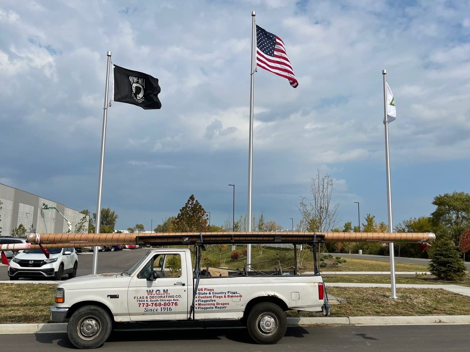 Is your flagpole in disrepair Are the ropes broken? Pulleys jammed? Cables grinding? Are flags wrapped or torn? We can help! WGN has more experience repairing and working with flagpoles than most companies combined and is your #1 source for flagpole repair in the Chicagoland area! No matter what size pole, commercial or residential, WE CAN FIX IT! We carry a huge supply of flagpole parts to get your pole back up and running quickly and in just-like-new condition.