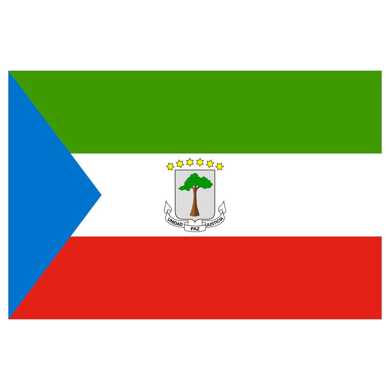 The national flag of Equatorial Guinea contains three equally sized bands of green, white, and red with a blue triangle at the hoist. The national coat of arms is located in the center of the flag. Our Equatorial Guinea flag is made of high-quality nylon with a canvas header and heavy-duty brass grommets.