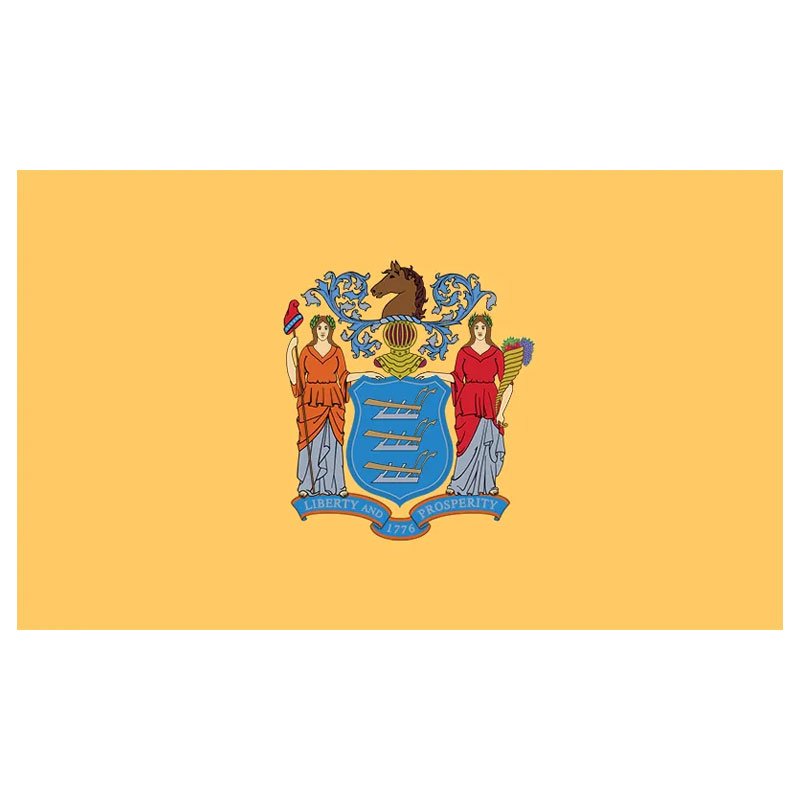 The official state flag of New Jersey features a light tan background with the state coat of arms in the center of the flag. Our New Jersey flag is crafted with high-quality nylon with a canvas header and heavy-duty brass grommets.
