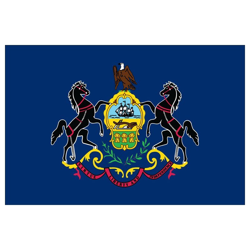 The official state flag of Pennsylvania has a blue background with the Pennsylvania state coat of arms located in the center of the flag. Our Pennsylvania flag is made of high-quality nylon with a canvas header and heavy-duty brass grommets.
