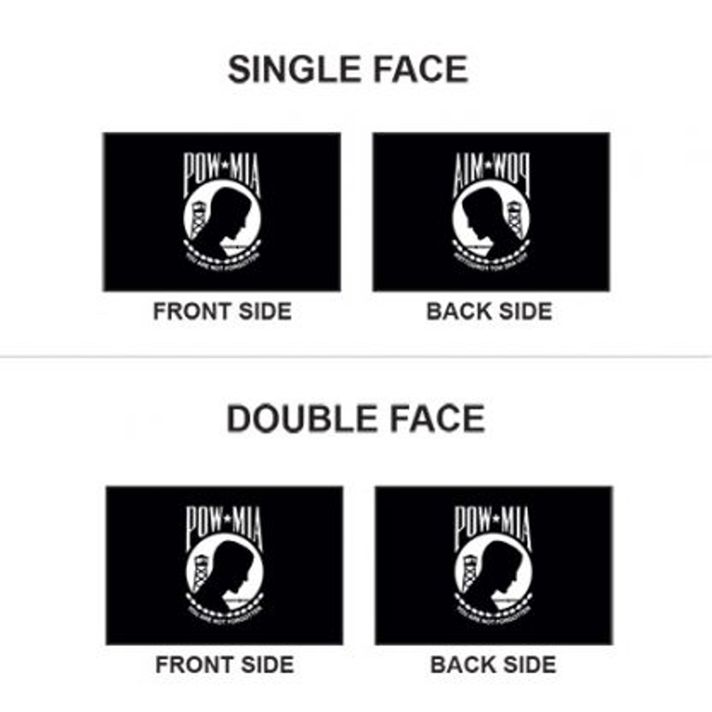 The POW/MIA double-face flag is printed on both sides and features a black background with the silhouette of a man’s head with a barbed wire fence and a watchtower. The words “POW/MIA” are written in white above the silhouette and the motto “You Are Not Forgotten.” Is written in white beneath the silhouette. Our POW/MIA Double-Face flag is made of high-quality nylon with a canvas header and heavy-duty brass grommets.