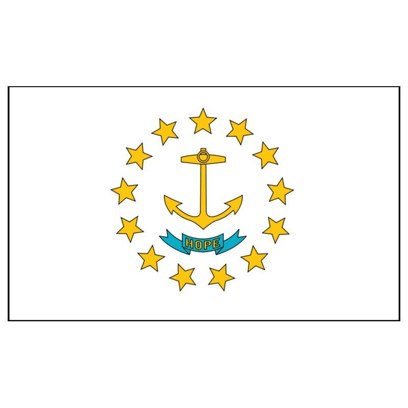 The official state flag of Rhode Island consists of a white background with a gold anchor in the center. Beneath the anchor, there is a blue ribbon with the state motto “Hope” in gold letters. The anchor and ribbon are surrounded by thirteen golden stars that form a circle. Our Rhode Island flag is made of high-quality nylon with a canvas header and heavy-duty brass grommets.