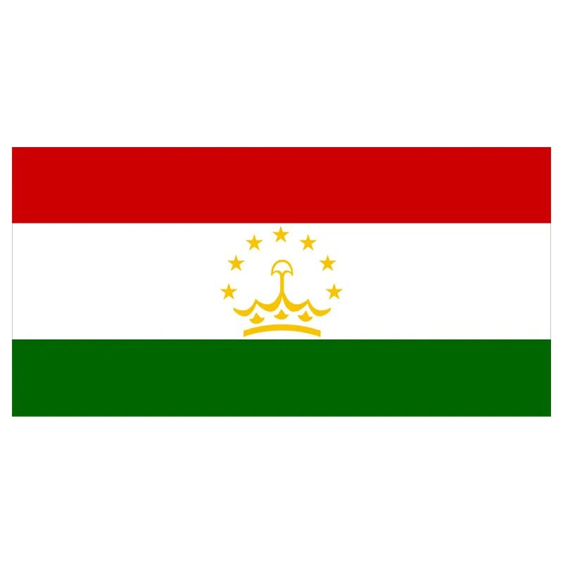 The national flag of Tajikistan has three equally sized horizontal bands of red, white, and green. A yellow crown is in the center and surrounded at the top by an arc of seven stars. Our Tajikistan flag is made of high-quality nylon with a canvas header and heavy-duty brass grommets.