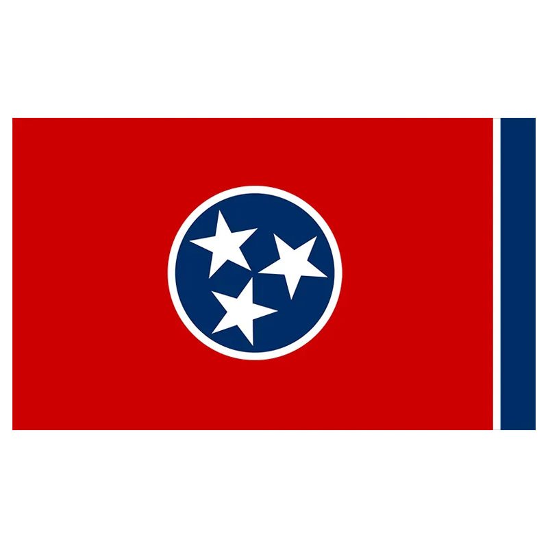 The official state flag of Tennessee has a red background with an emblem in the center that consists of a blue circle with a white border that holds three white stars. A stripe of blue bordered by white runs vertically on the fly end. Our Tennessee flag is made of high-quality nylon with a canvas header and heavy-duty brass grommets.