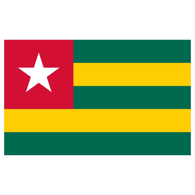 The national flag of Togo has five equally sized horizontal bands of green and yellow. In the canton, there is a white five-pointed star inside a red square. Our Togo flag is made of high-quality nylon with a canvas header and heavy-duty brass grommets.